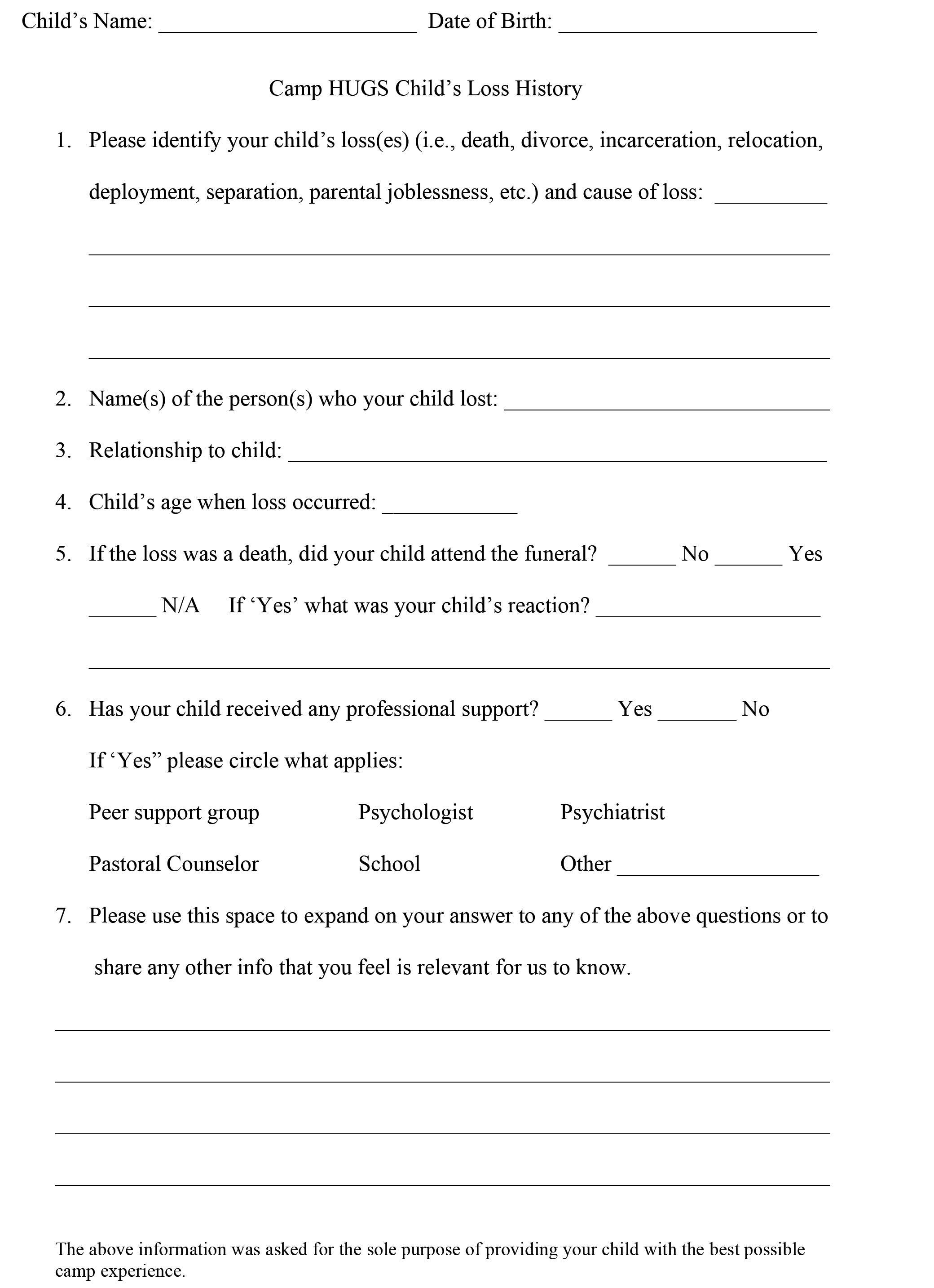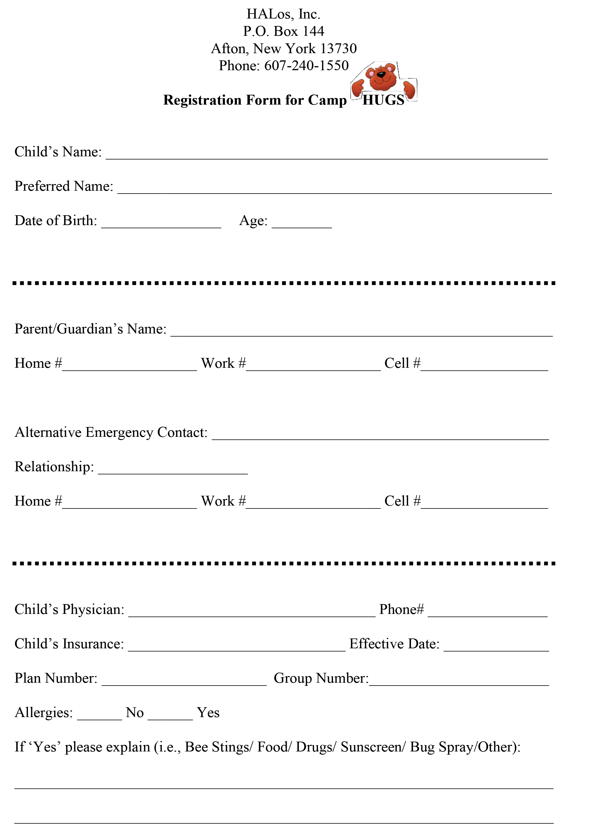 Camp HUGS Registration Forms. 2023 Dates TBD.