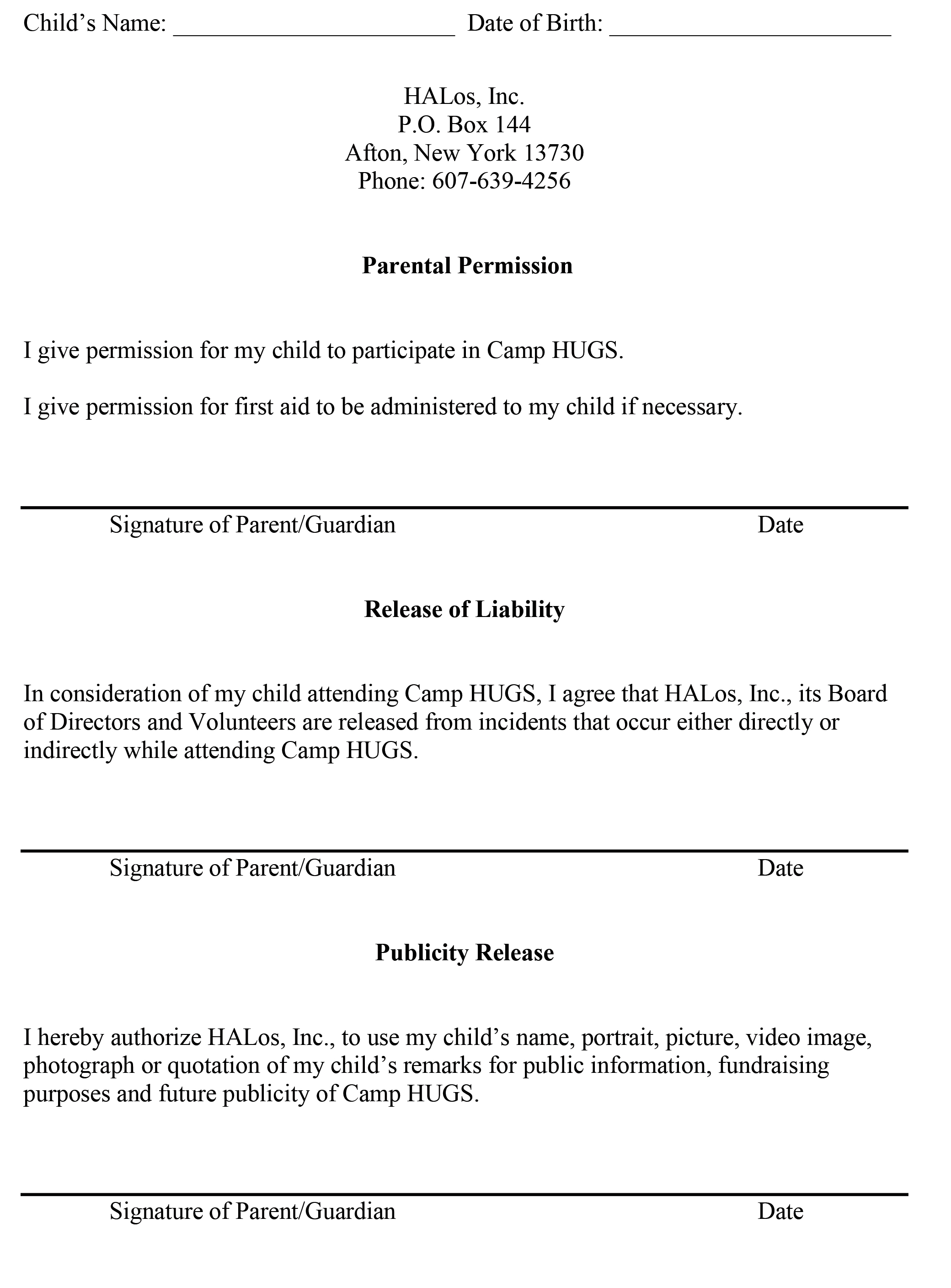 Please email completed forms to HALosOrg@aol.com
